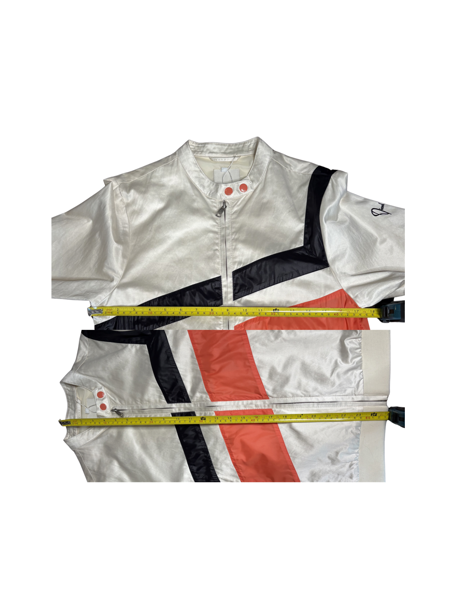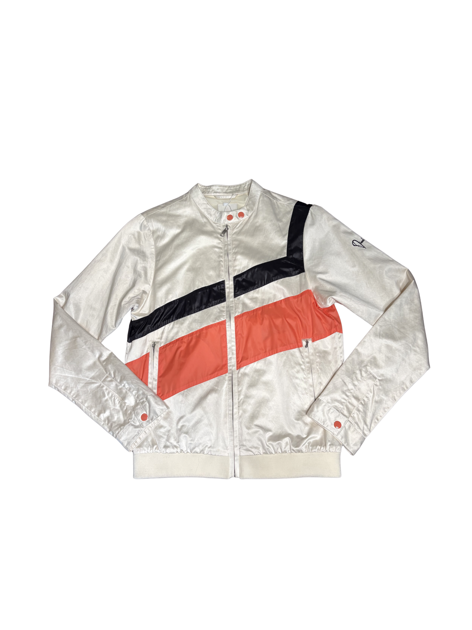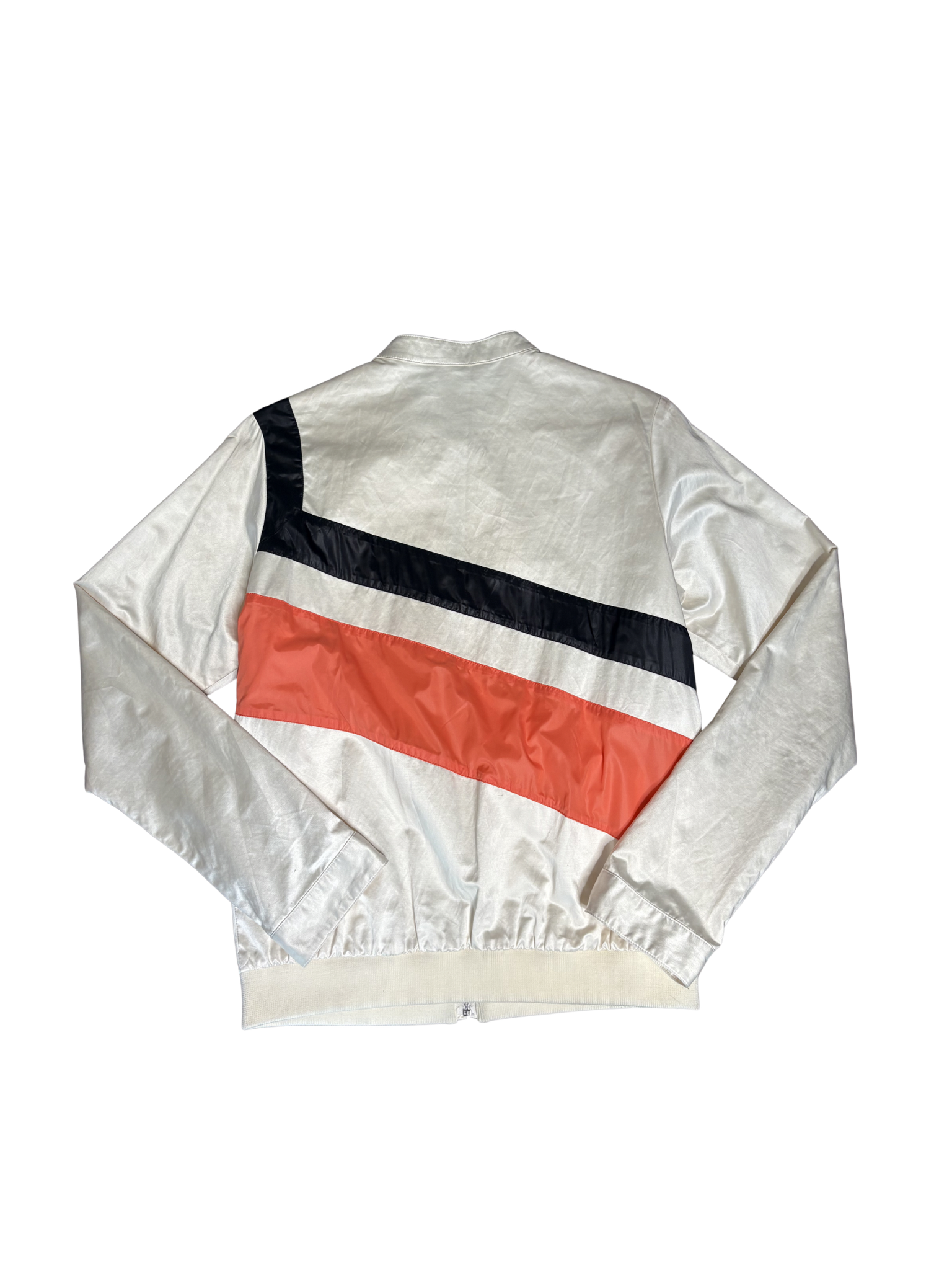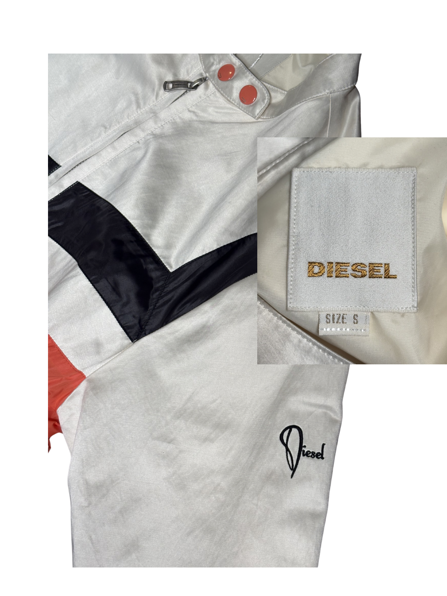 Sleek with a sporty edge, this vintage Diesel jacket features a glossy satin finish in a soft champagne tone with bold black and coral panel detailing across the front. Designed with a zip-up front, snap collar, and ribbed hem for a structured yet relaxed fit. Finished with subtle Diesel branding on the sleeve and functional zip pockets.