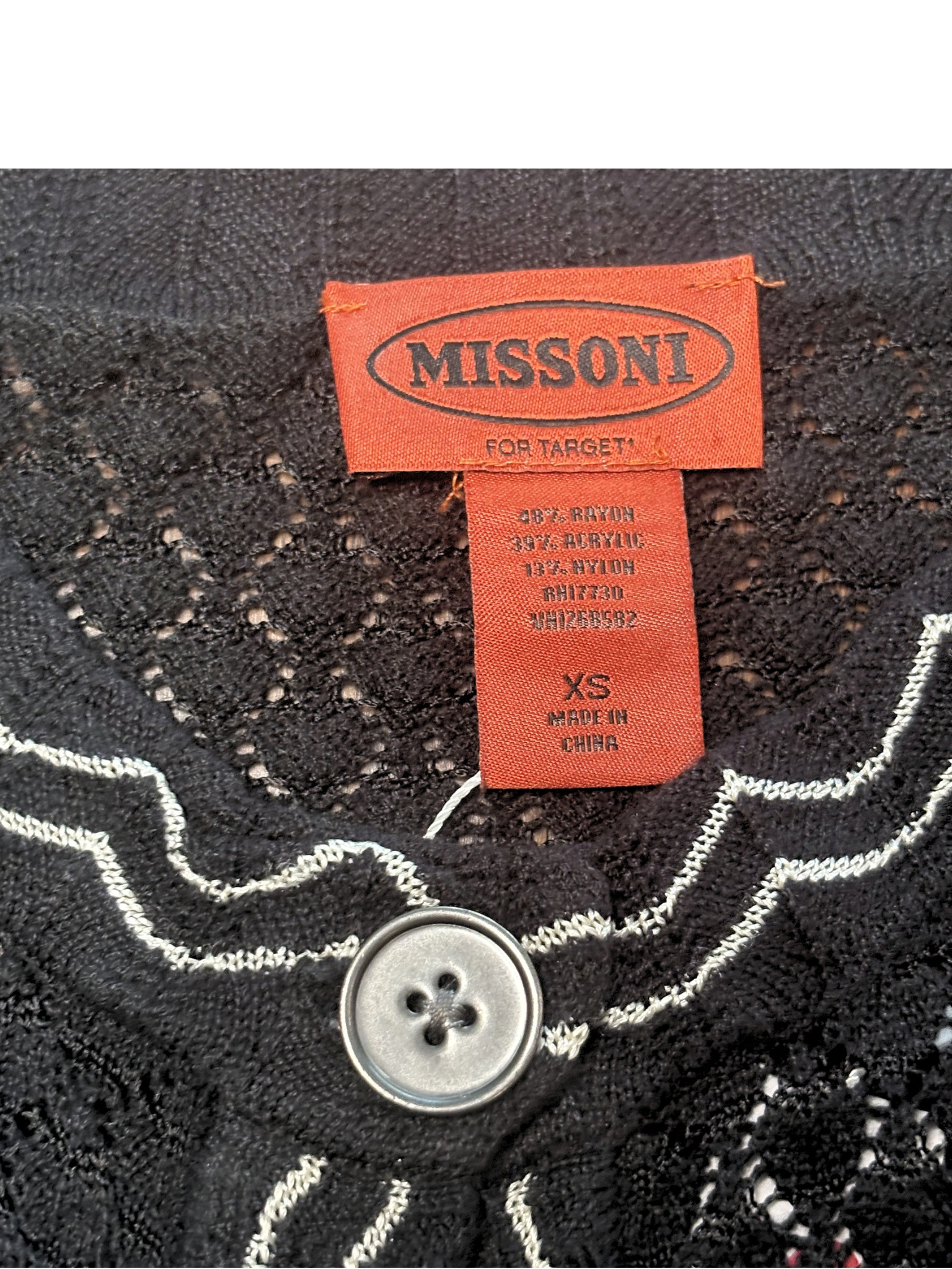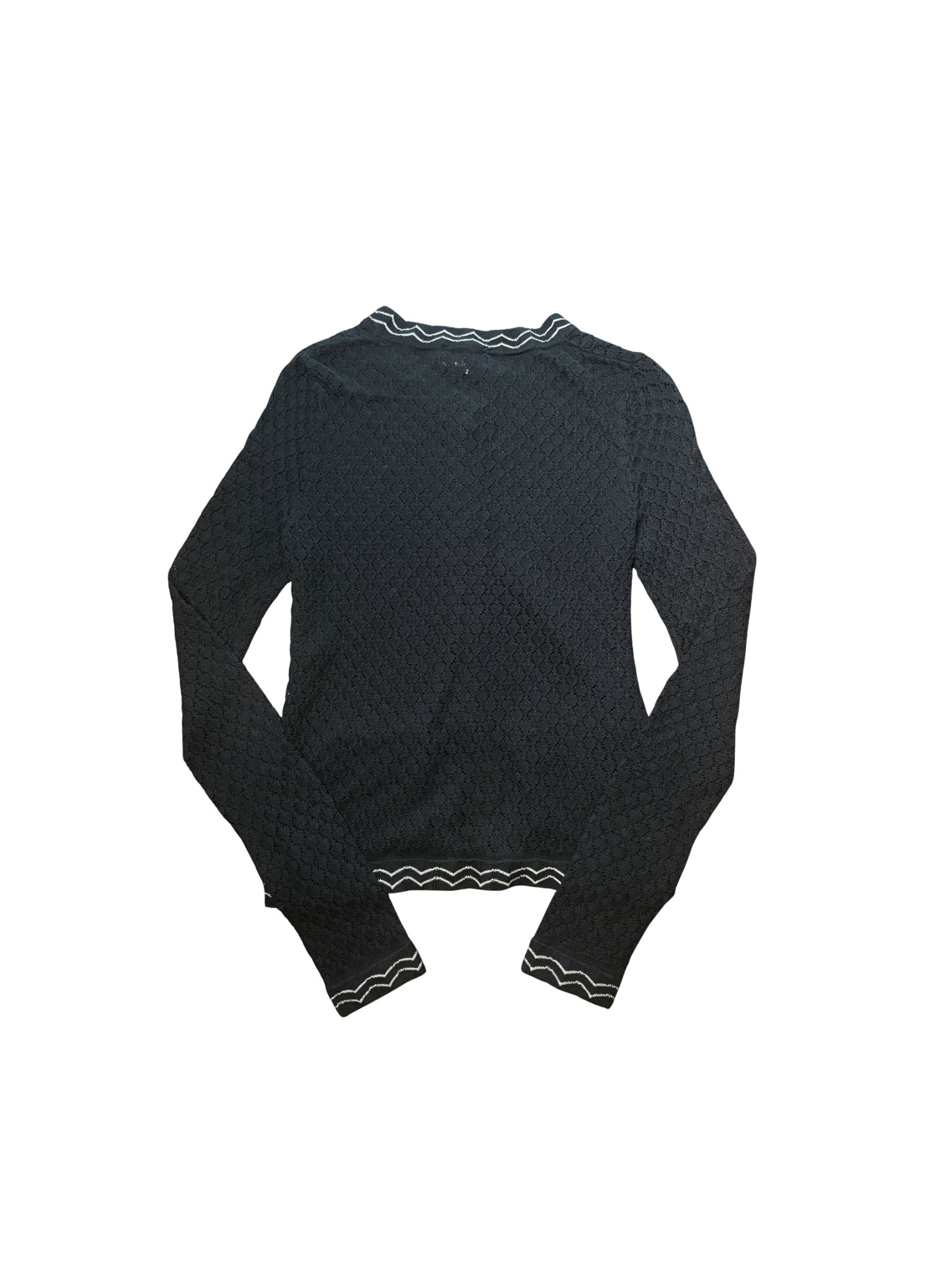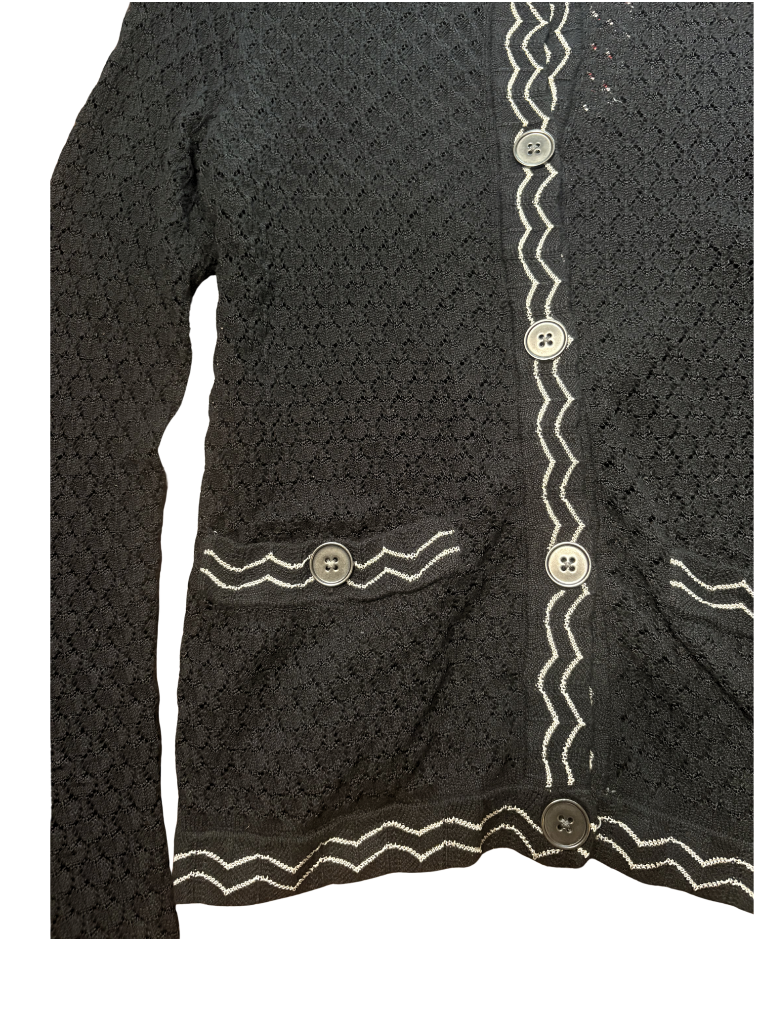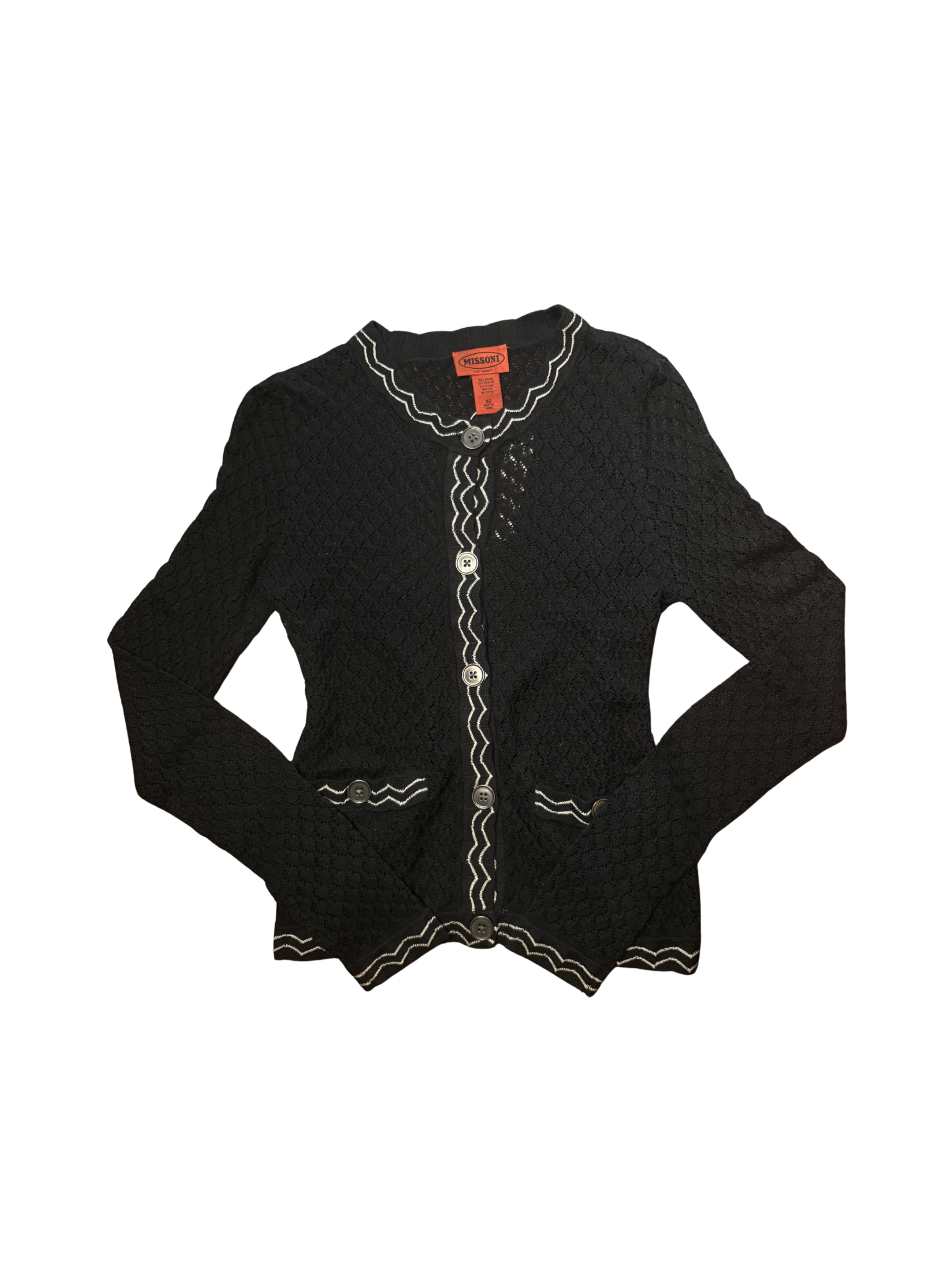This black knit cardigan is a chic everyday staple with signature Missoni flair. It features delicate textured detailing with subtle zigzag trim throughout. Designed with a classic button-front, front pockets, and a slightly fitted silhouette for an easy, polished look. Lightweight and breathable, it’s perfect for layering year-round. Finished with iconic Missoni design elements.
