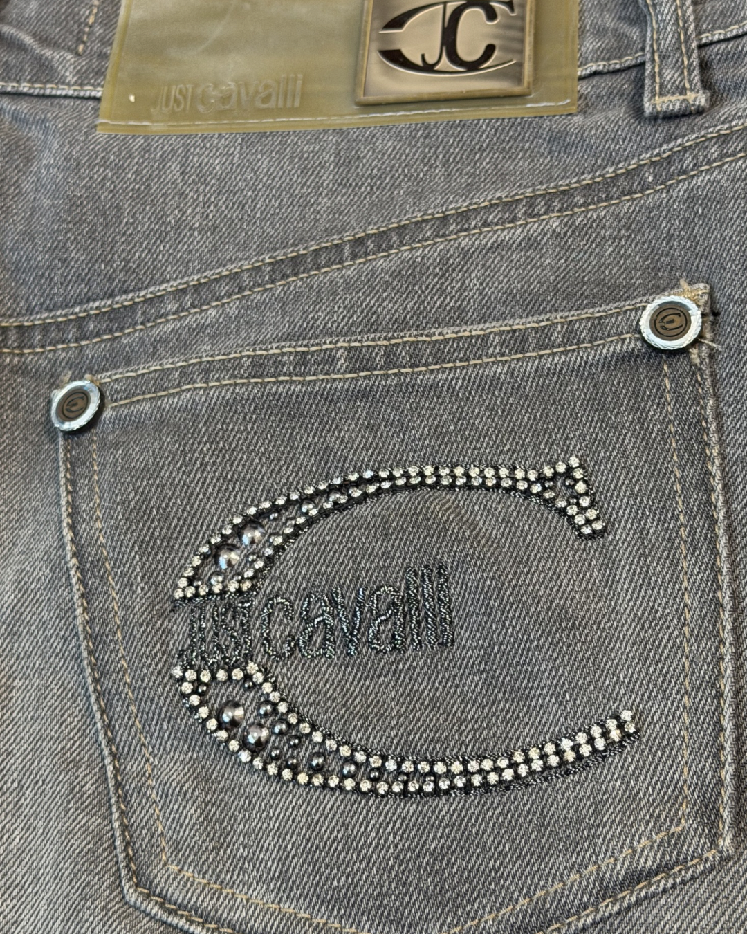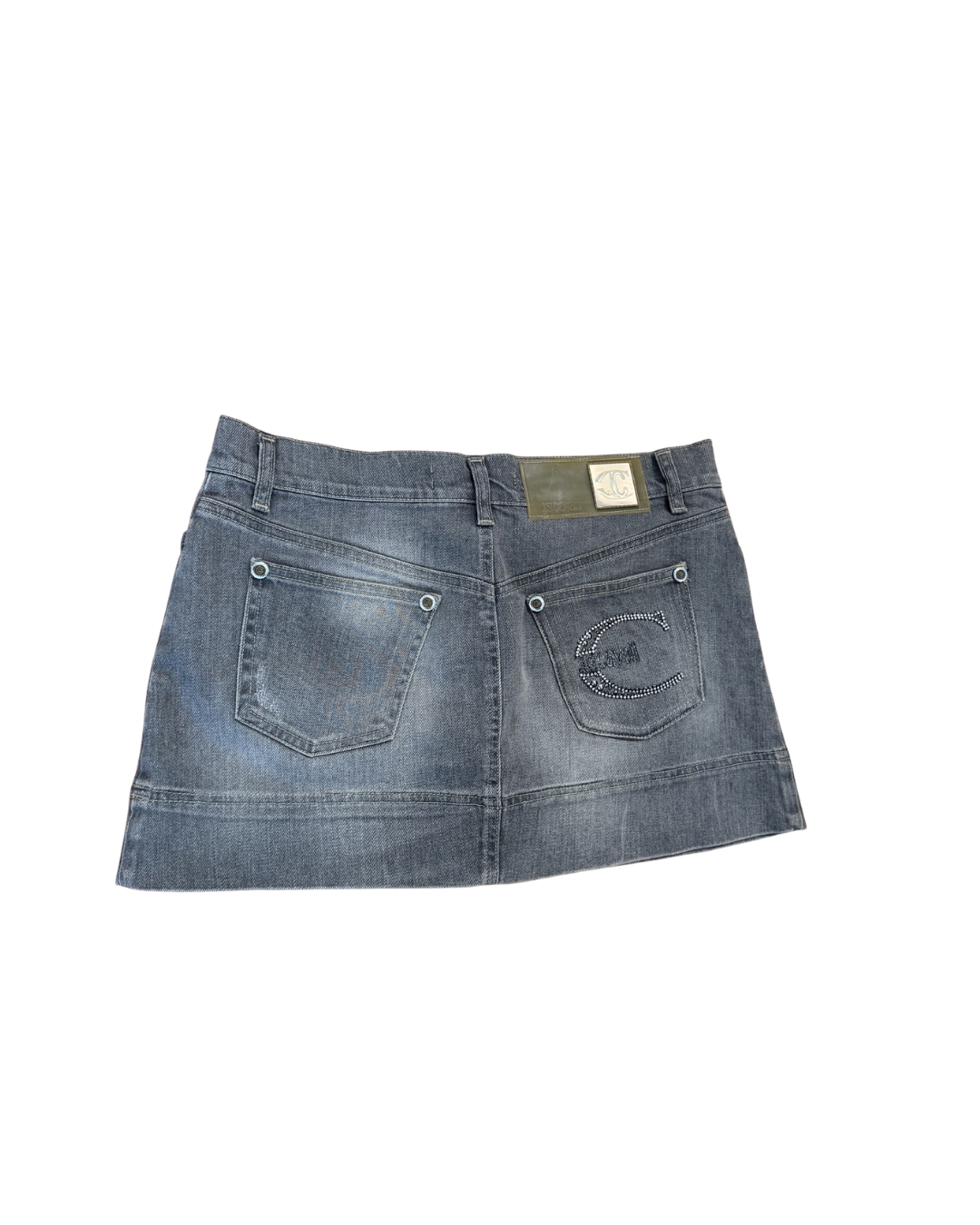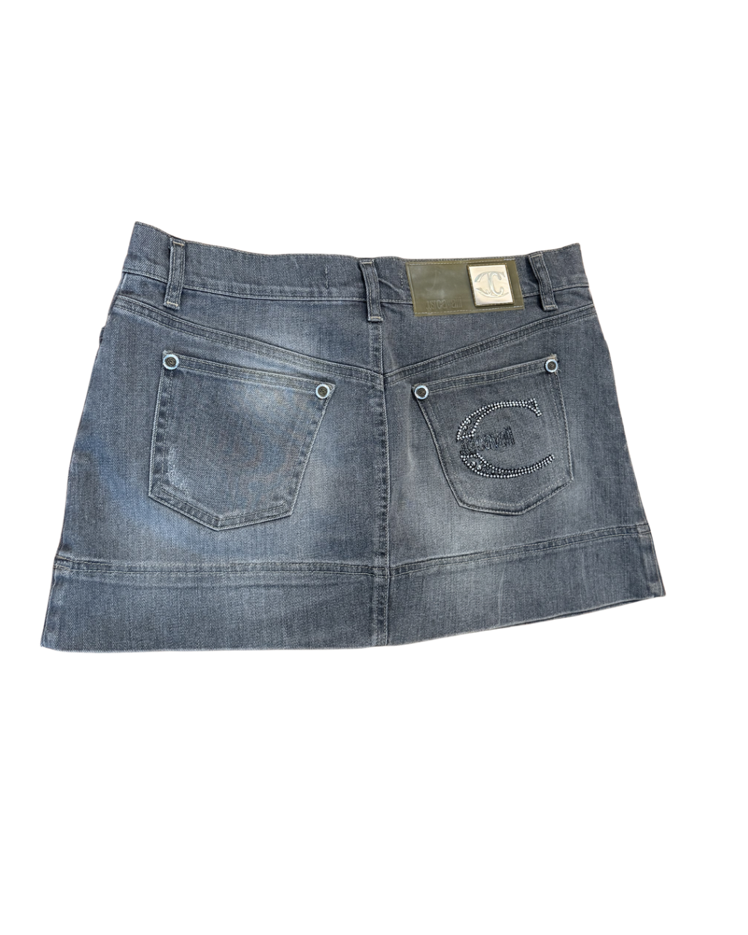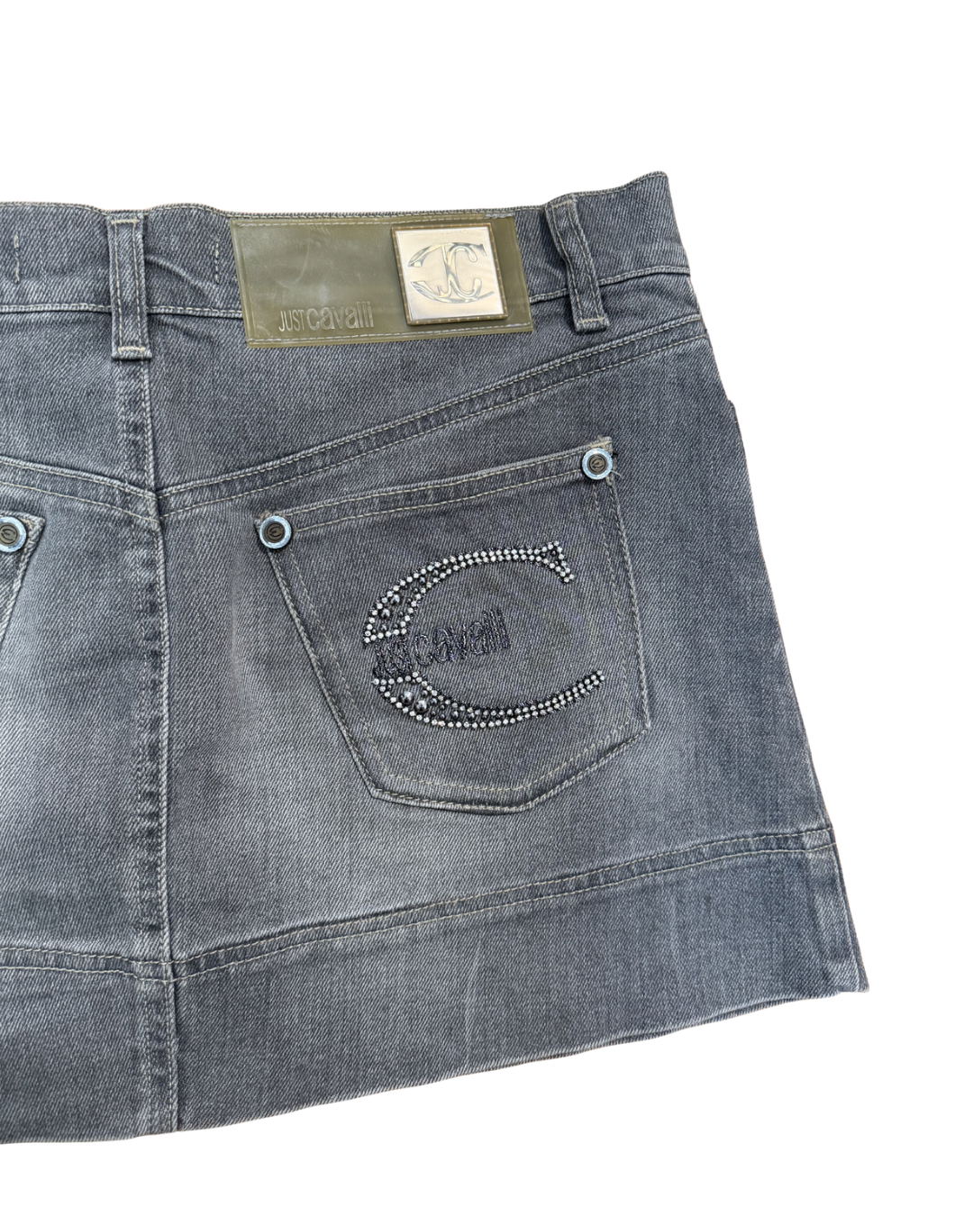 Iconic early 2000s Just Cavalli mini skirt in a perfectly faded grey wash. Features a low-rise fit with subtle distressing and a structured silhouette. The back pocket steals the show with a perfectly rhinestoned “C” logo and Just Cavalli embroidery for that signature glam edge. Excellent condition!