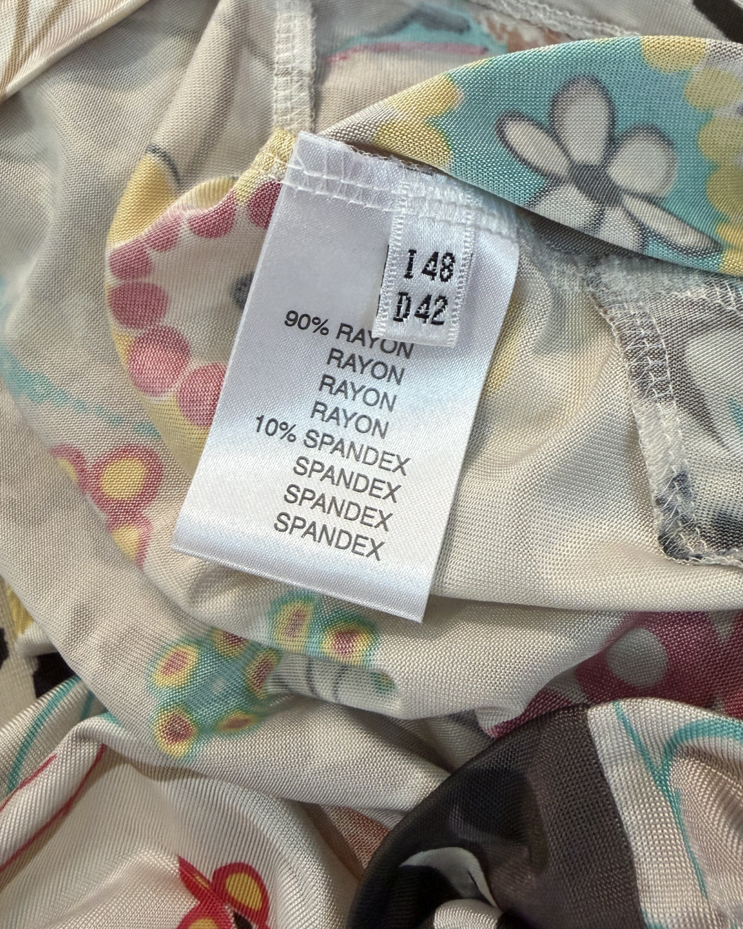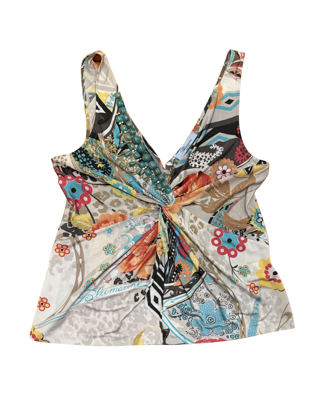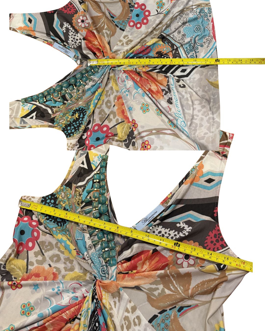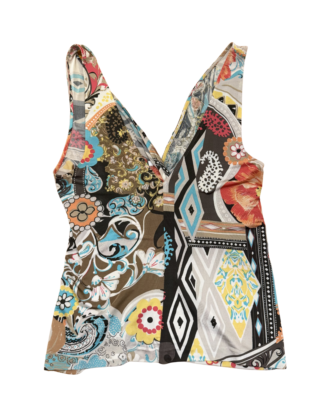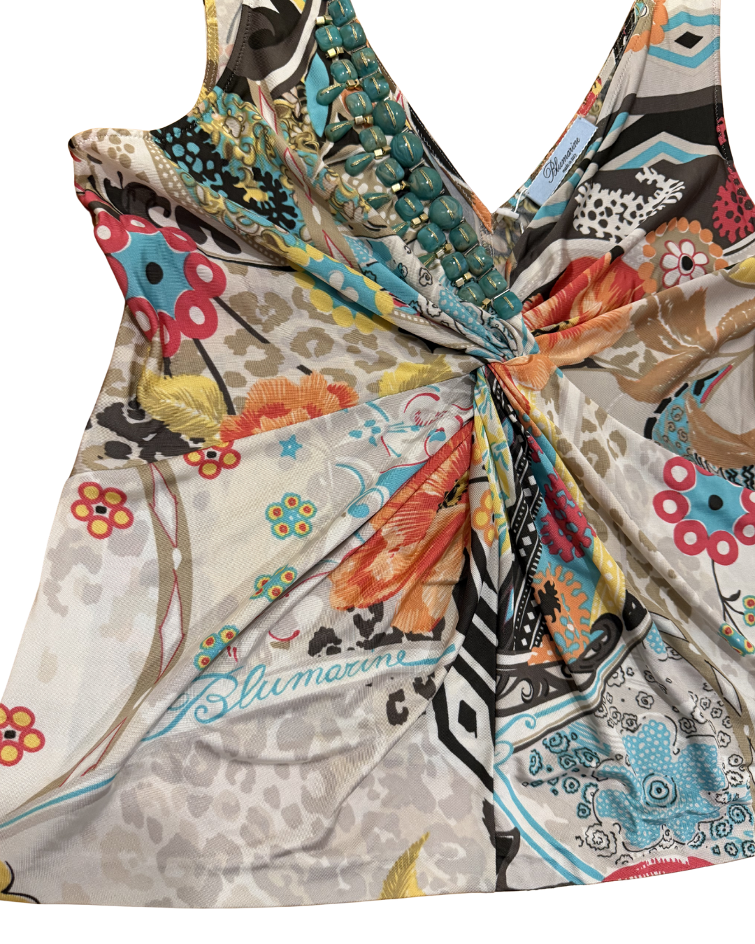 A vibrant, statement-making vintage piece from Blumarine, this top captures the brand’s signature playful glamour and early 2000s energy. Crafted in a silky, lightweight fabric, it features a colorful patchwork-inspired print blending florals, geometrics, and soft neutral tones for a perfectly eclectic look. The standout twisted front detail creates a flattering, sculpted silhouette, while the deep neckline adds a touch of effortless allure. Finished with turquoise beaded embellishments along the strap, it brings just the right amount of texture and shine. Excellent condition!