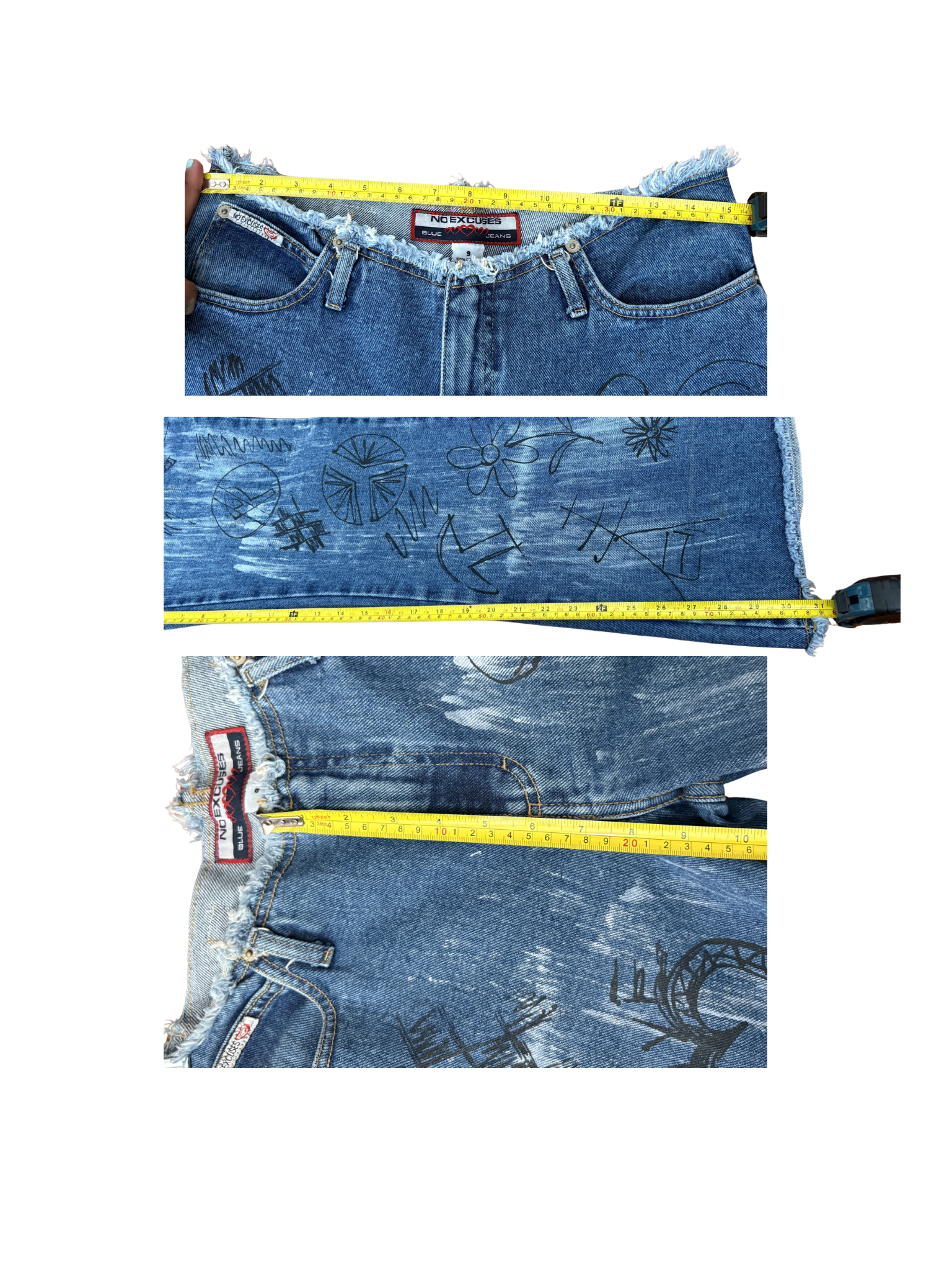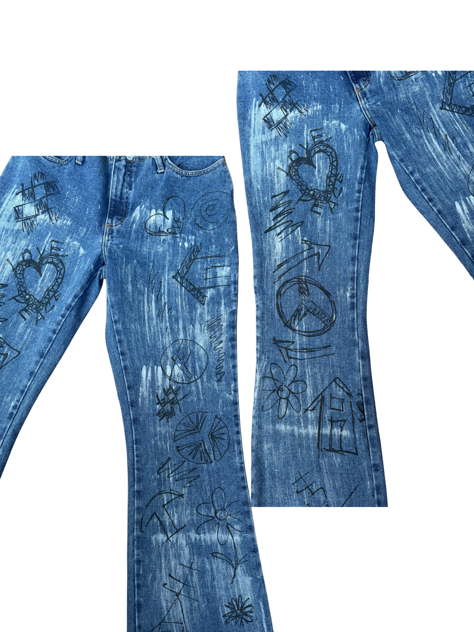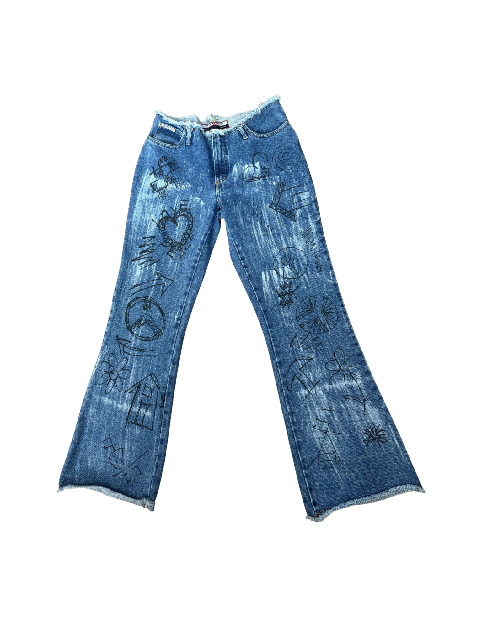 Vintage No Excuses blue jeans reworked with hand-drawn graffiti-style detailing throughout. This pair features a flattering mid-rise fit with a flared leg, raw frayed waistband, and subtle distressing for that perfectly worn-in feel. The doodle graphics give it a one-of-a-kind, DIY edge. Soft, broken-in cotton with just the right amount of structure.