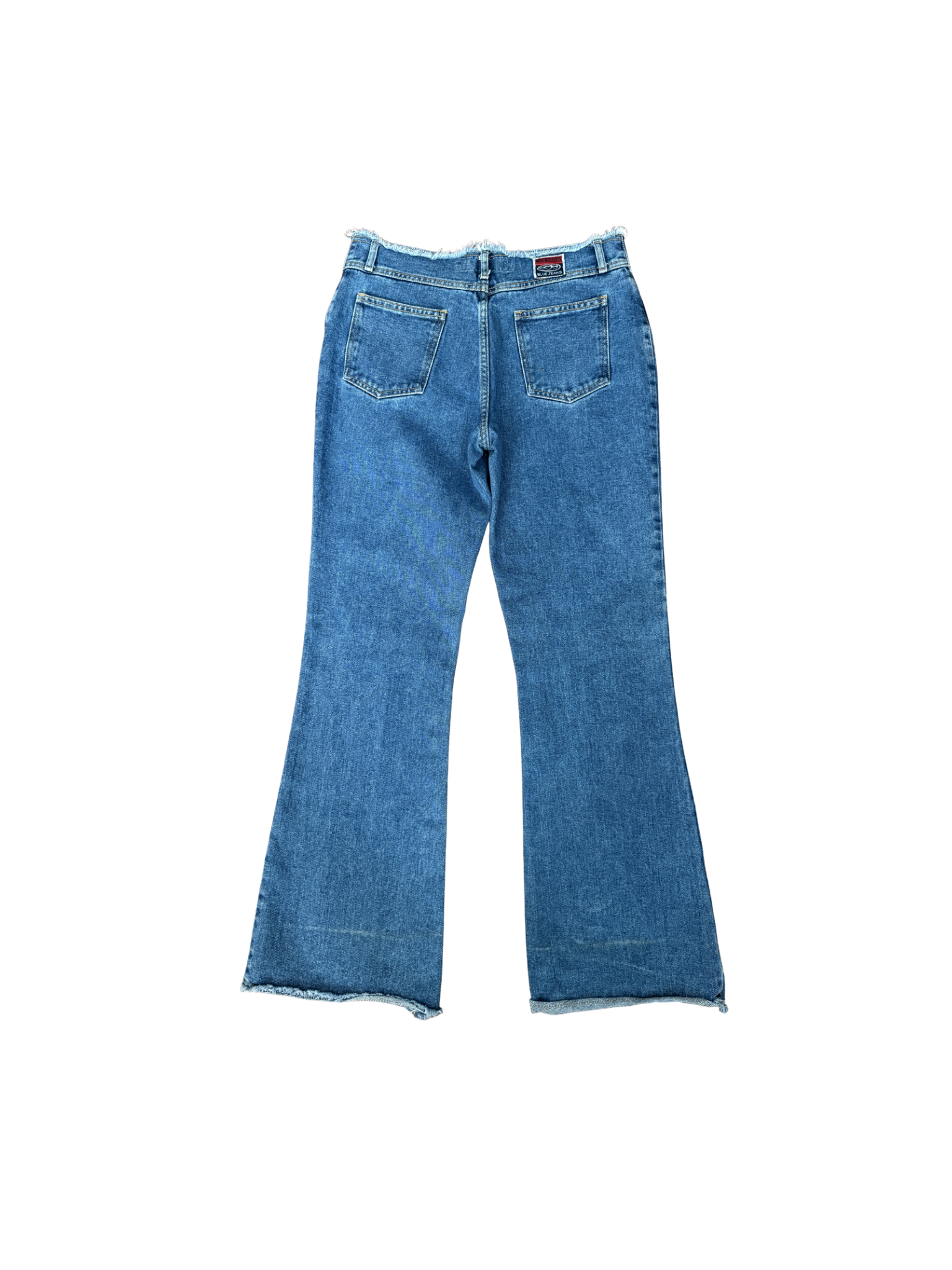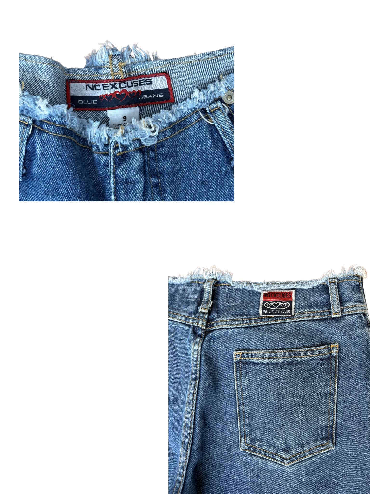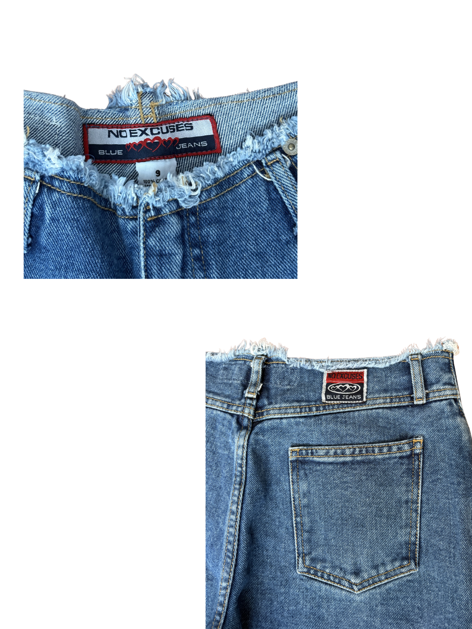 Vintage No Excuses blue jeans reworked with hand-drawn graffiti-style detailing throughout. This pair features a flattering mid-rise fit with a flared leg, raw frayed waistband, and subtle distressing for that perfectly worn-in feel. The doodle graphics give it a one-of-a-kind, DIY edge. Soft, broken-in cotton with just the right amount of structure.