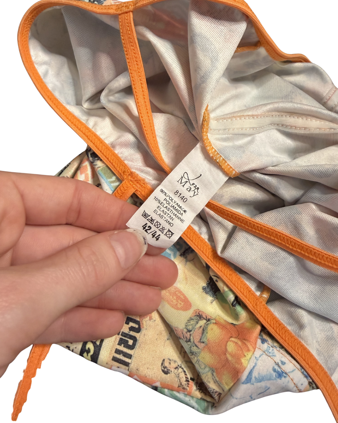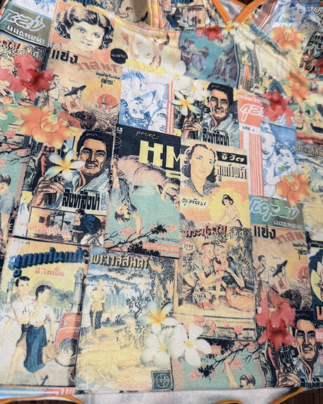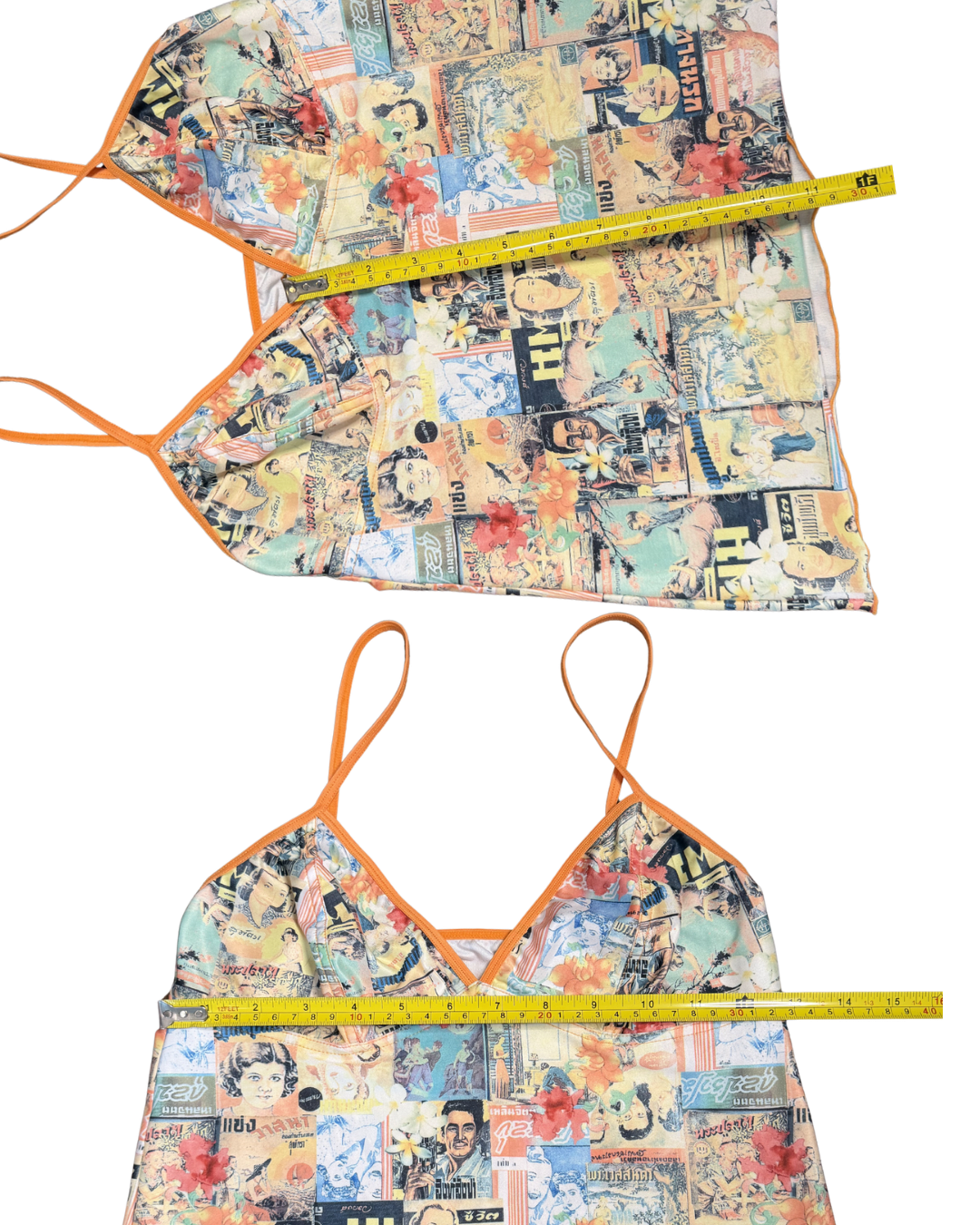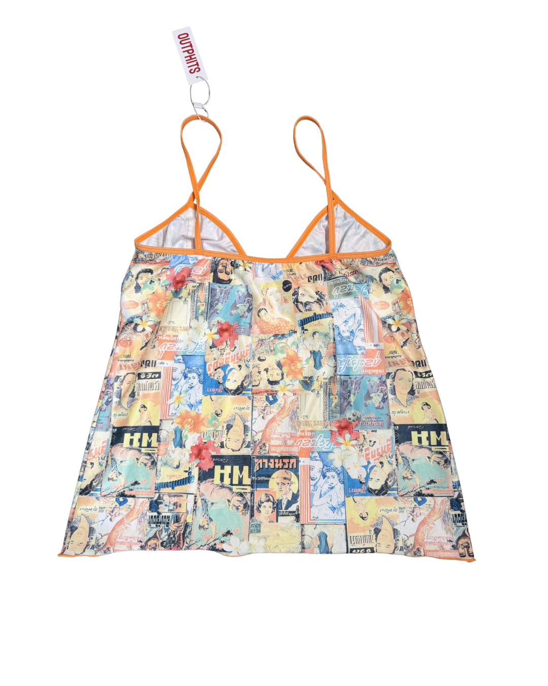 A vintage statement cami with a vibrant collage print of retro Thai magazine graphics and florals. Finished with a bold orange trim. In excellent condition!
