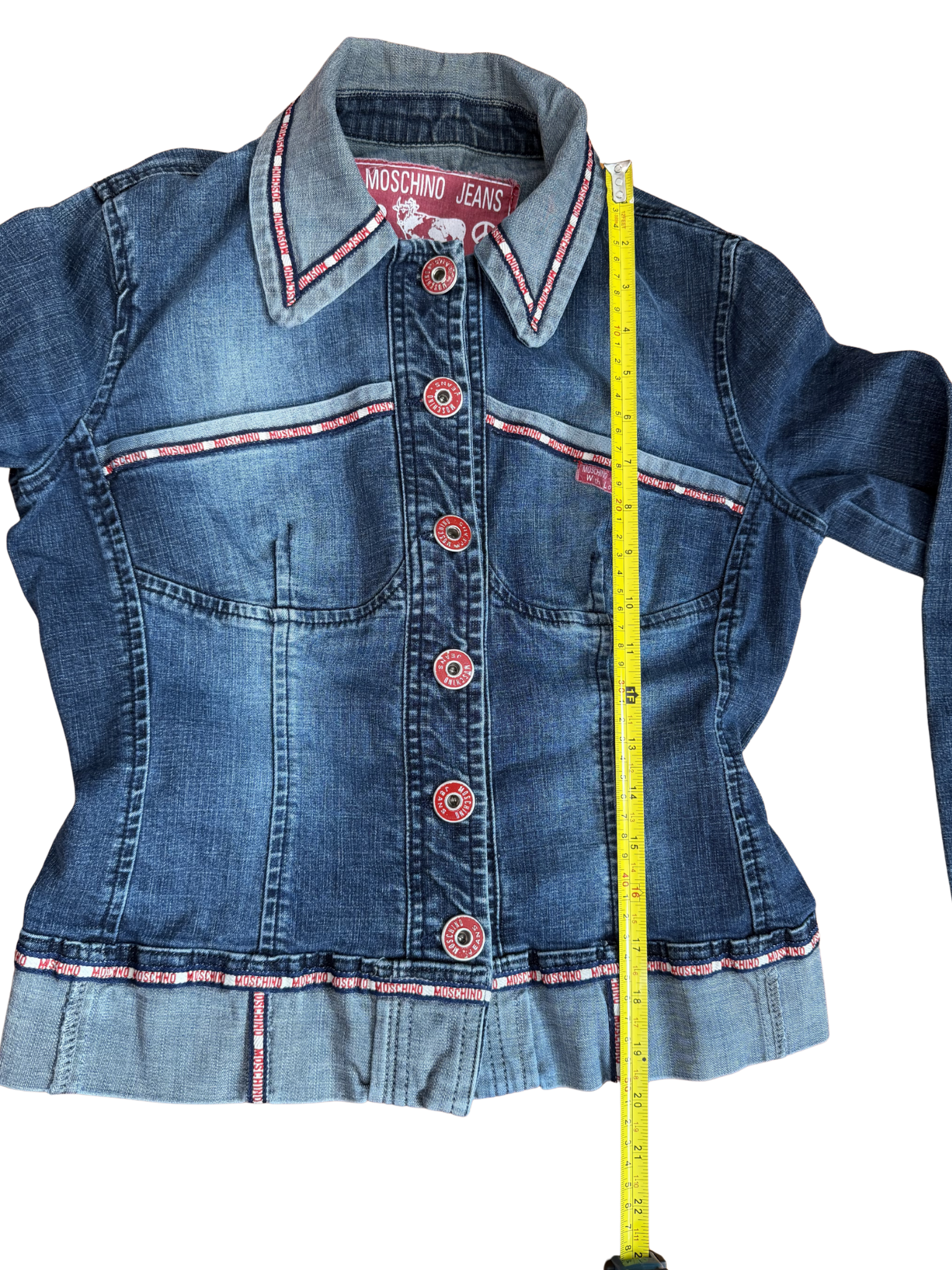 Best fit for a size medium- see measurements. Fitted vintage Moschino Jeans denim jacket featuring a structured silhouette and classic red details. Crafted in a medium-wash denim with natural fading throughout, finished with signature red Moschino logo trim along the seams and collar. Front button closure with branded red buttons, dual chest pockets, and a slightly cinched waist for a flattering shape. Iconic Moschino “With Love” label at the neckline adds a playful touch.