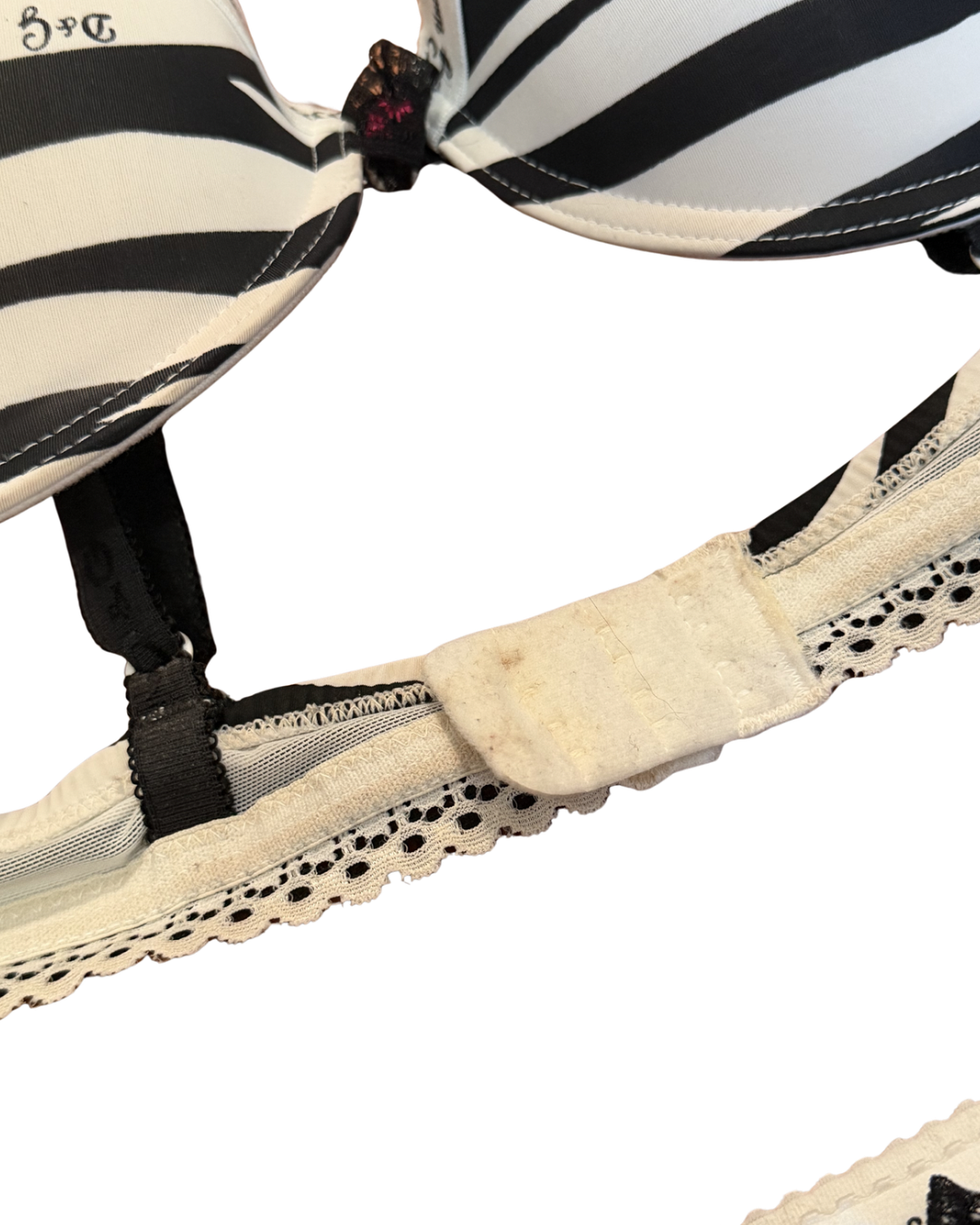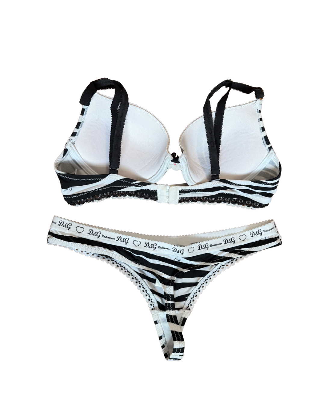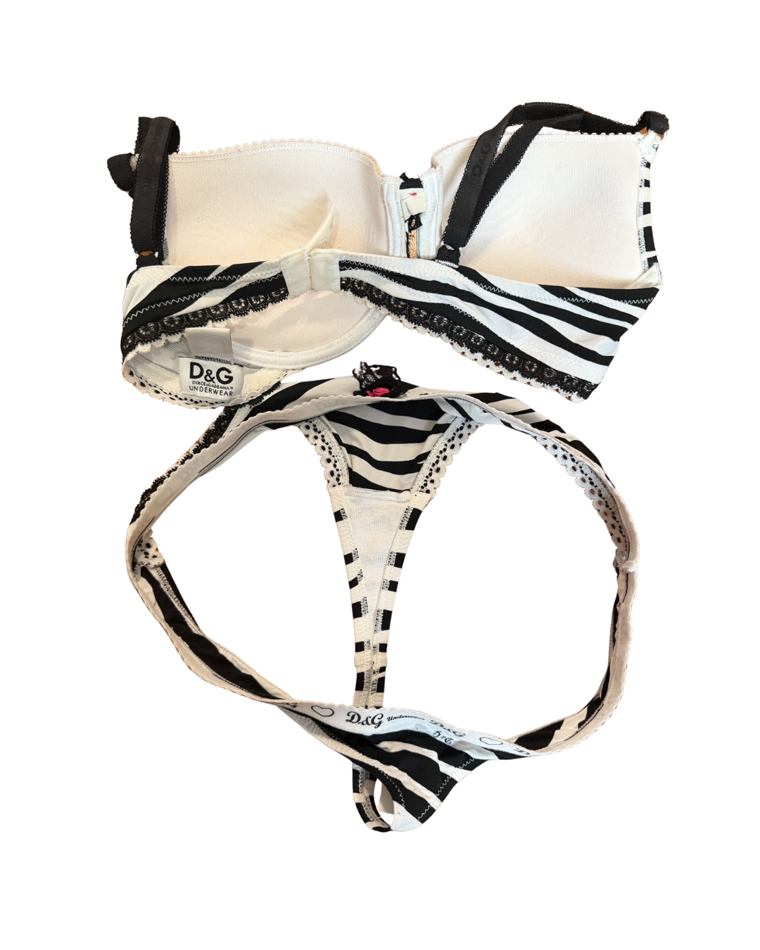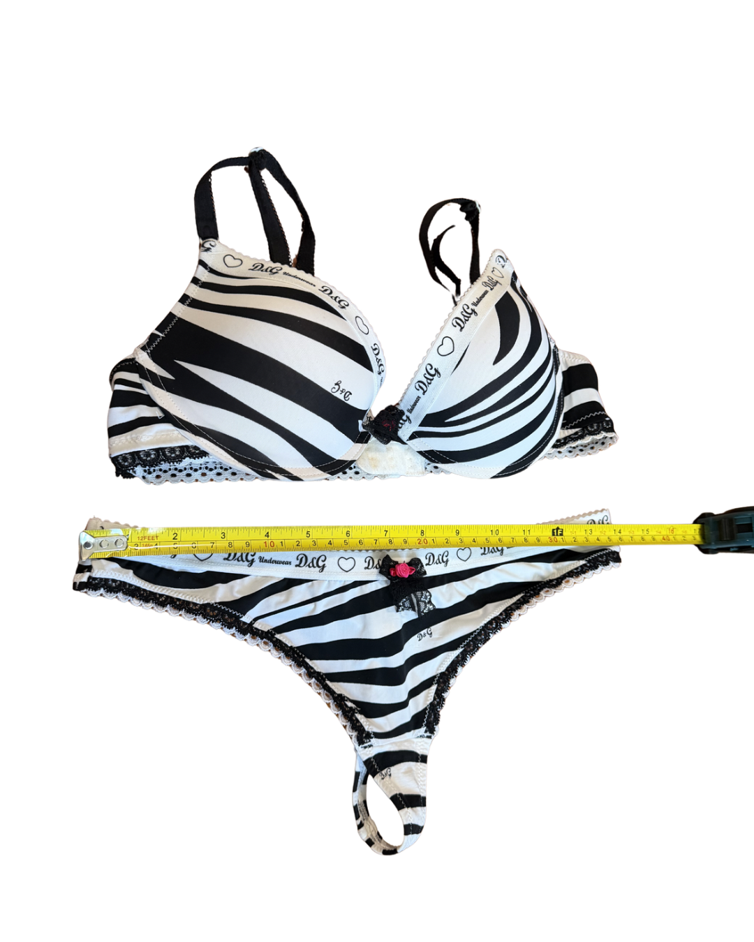 In great condition, featuring a striking black-and-white zebra stripe print, this set embodies early 2000s D&G energy—playful, confident, and unapologetically sexy. The structured, padded bra offers flattering support with soft contour cups, finished with delicate lace trim and signature D&G logo detailing along the band. The matching thong mirrors the same graphic print, accented with dainty lace edging and a subtle rosette detail at the front for a flirty finish.
