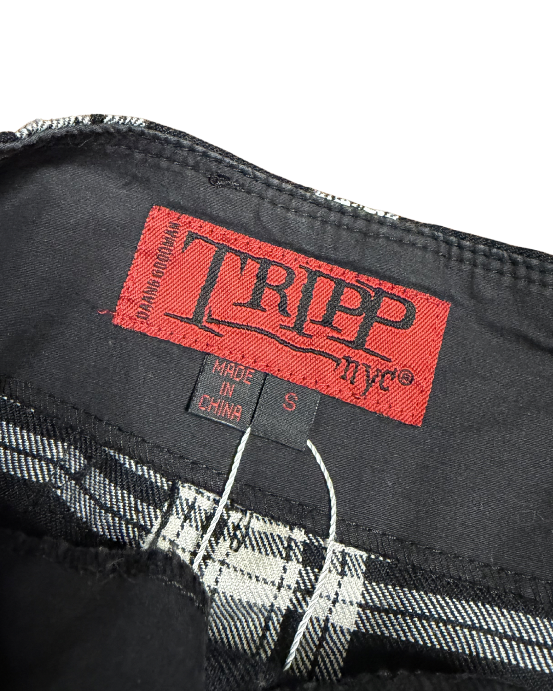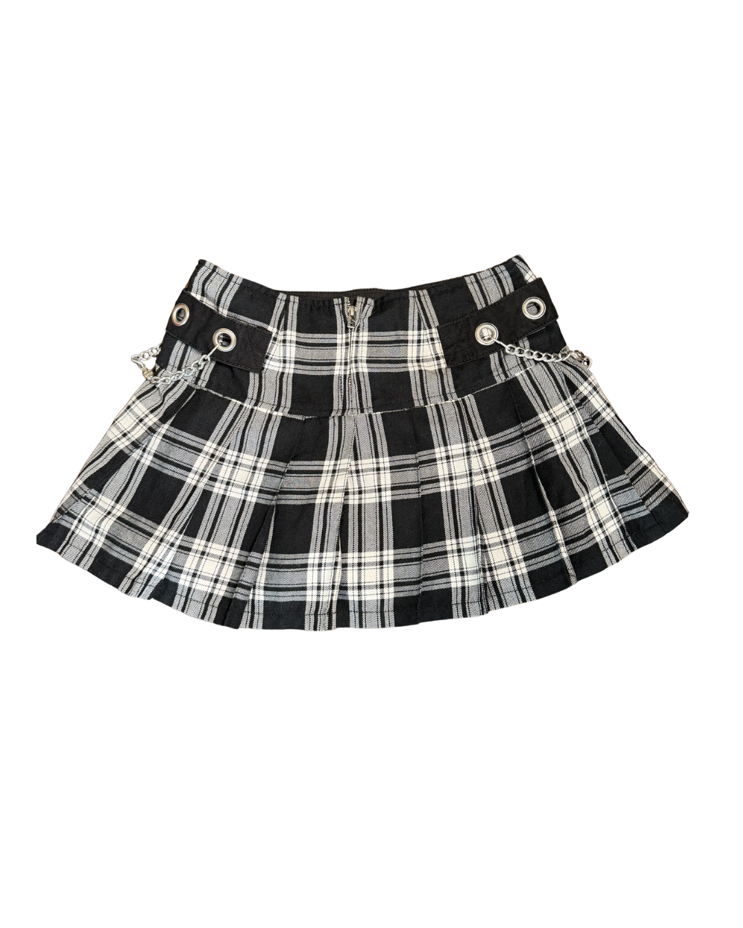 Featuring a classic black and white tartan print, this Tripp NYC mini is elevated with a built-in grommet belt and silver skull chain details that drape effortlessly across the waist. The structured pleating gives it that iconic micro-mini silhouette, while the hardware adds just the right amount of attitude. Excellent condition.