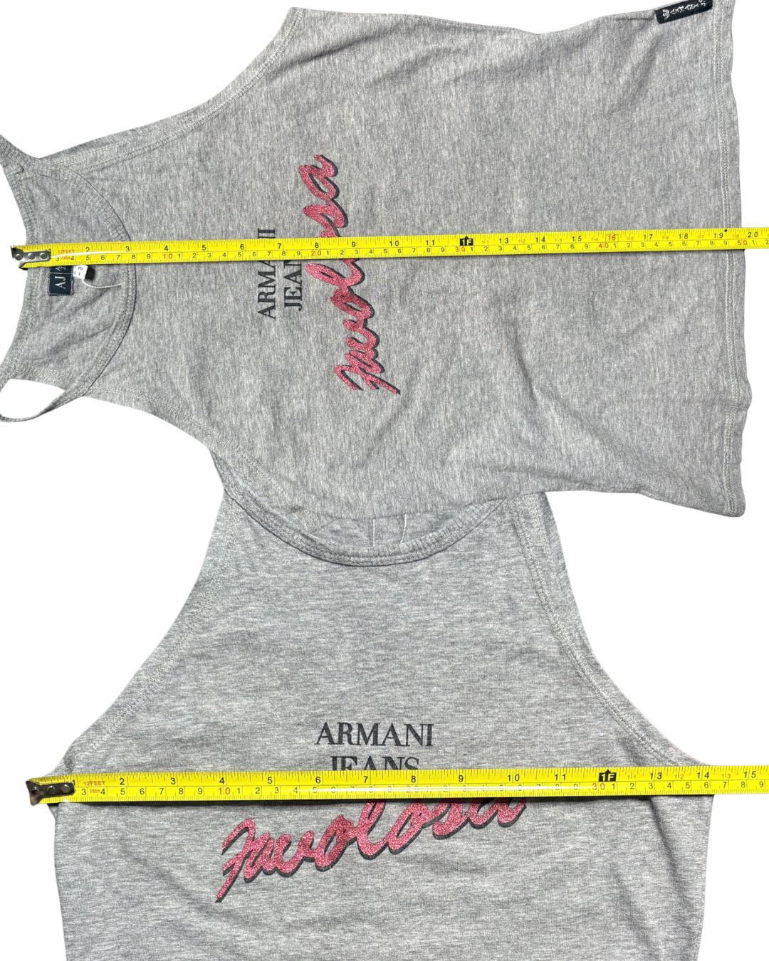 Made in Italy, sleek, sporty, and effortlessly iconic—this vintage Armani Jeans tank is a true Y2K staple. Crafted in a soft heather grey, it features a flattering high neckline and a slightly fitted silhouette that hugs just right. The front is finished with classic Armani Jeans lettering and a bold pink “Favolosa” graphic—Italian for fabulous—adding the perfect pop of playful attitude. Lightweight and easy to style, this piece works just as well dressed down with denim as it does layered for a more elevated, off-duty look. A timeless designer basic with a little extra personality—exactly what your wardrobe’s been missing. Excellent condition!