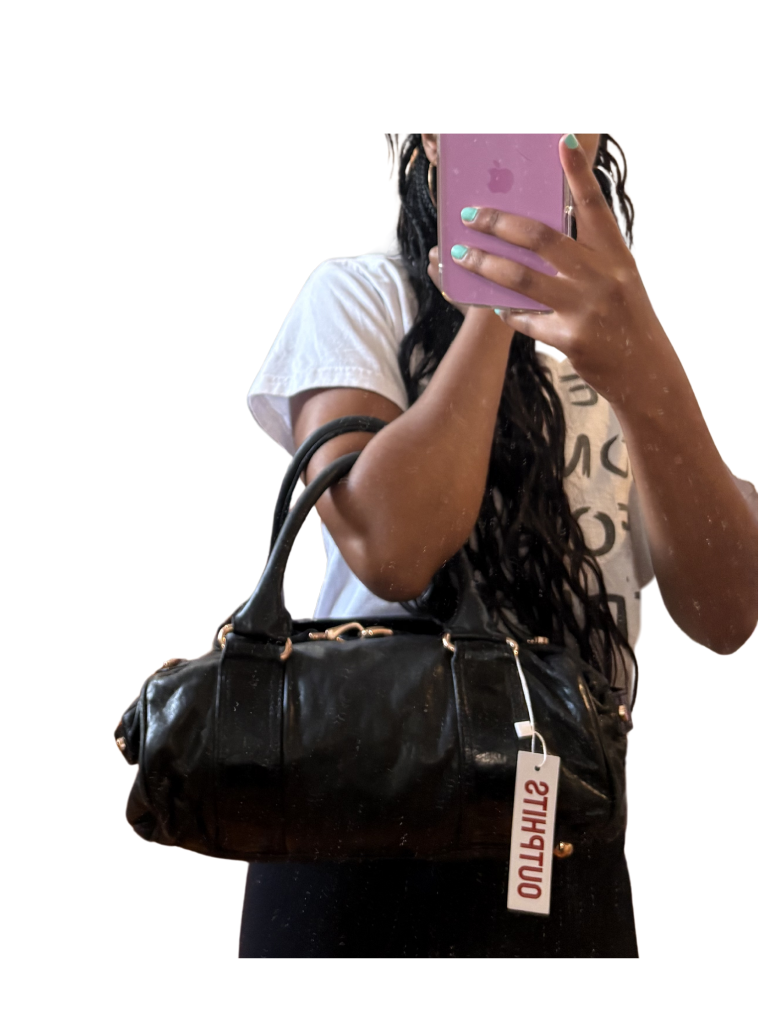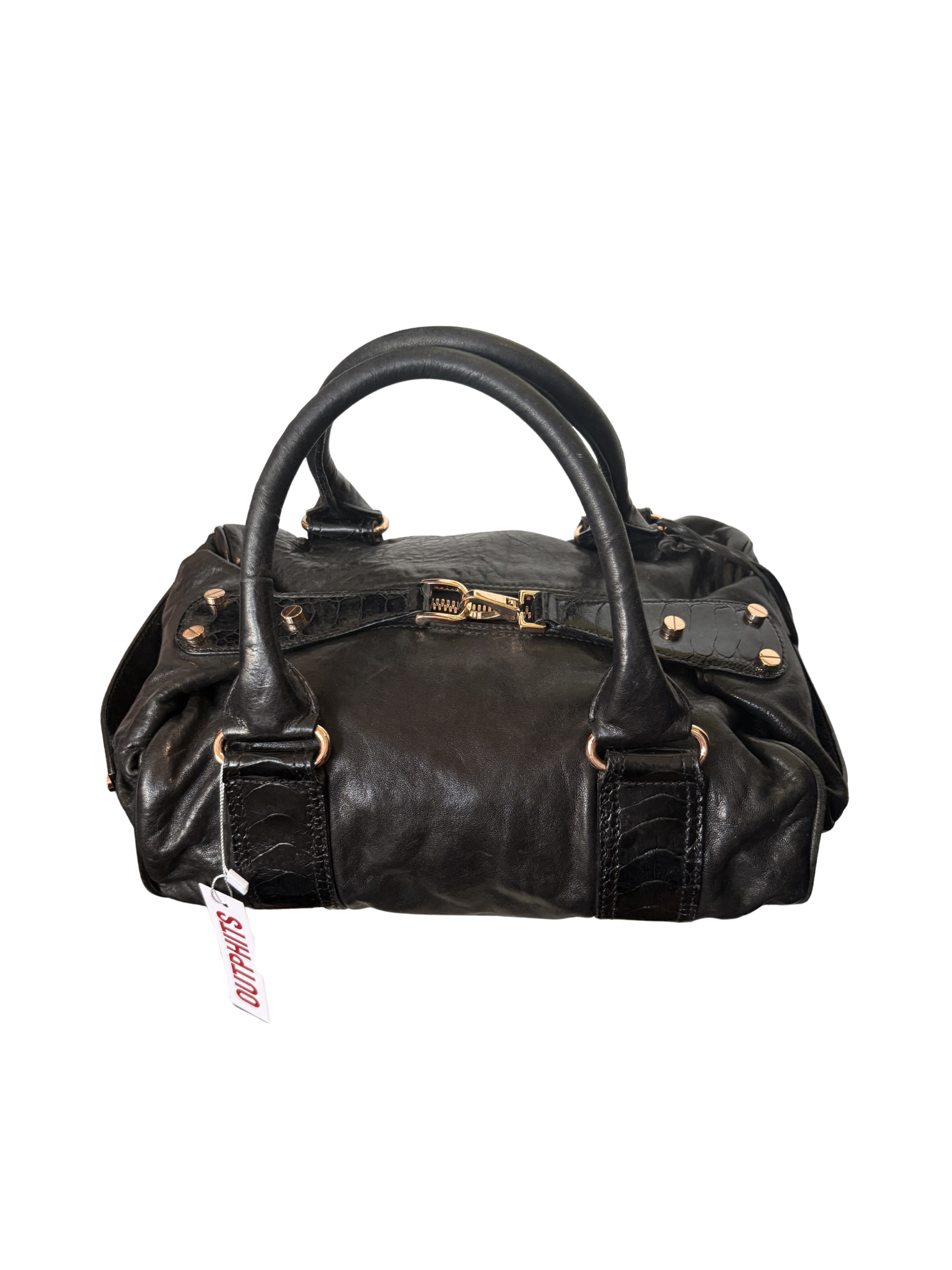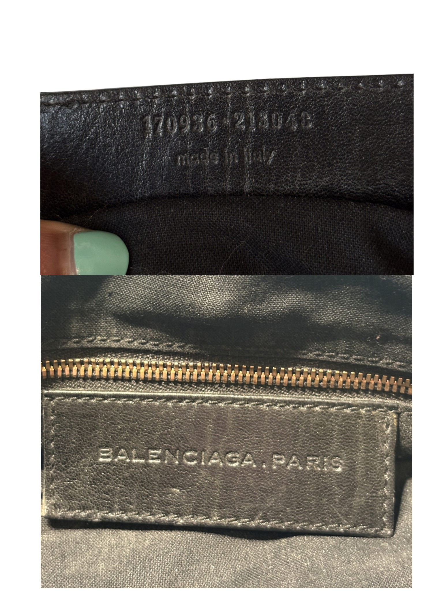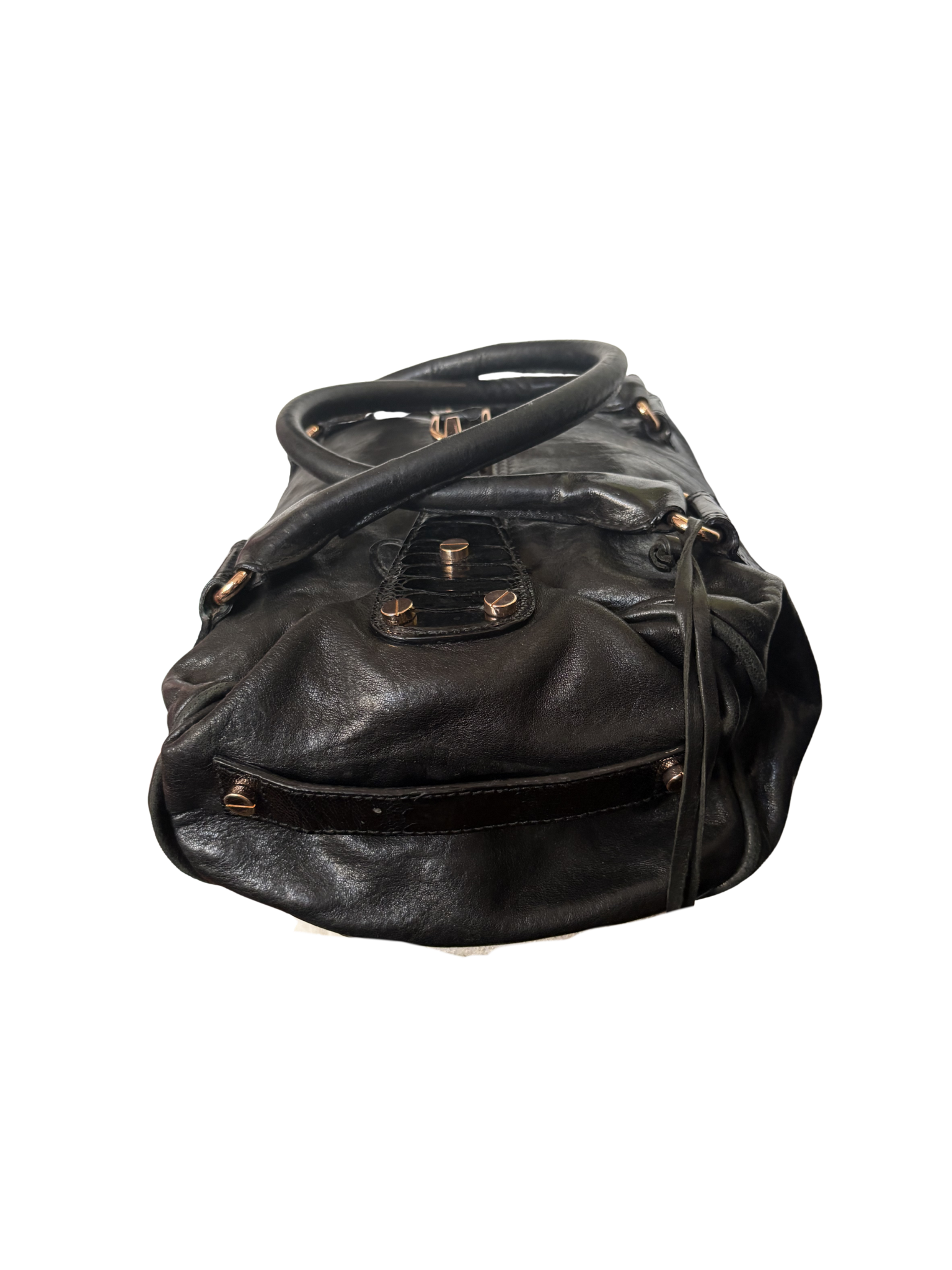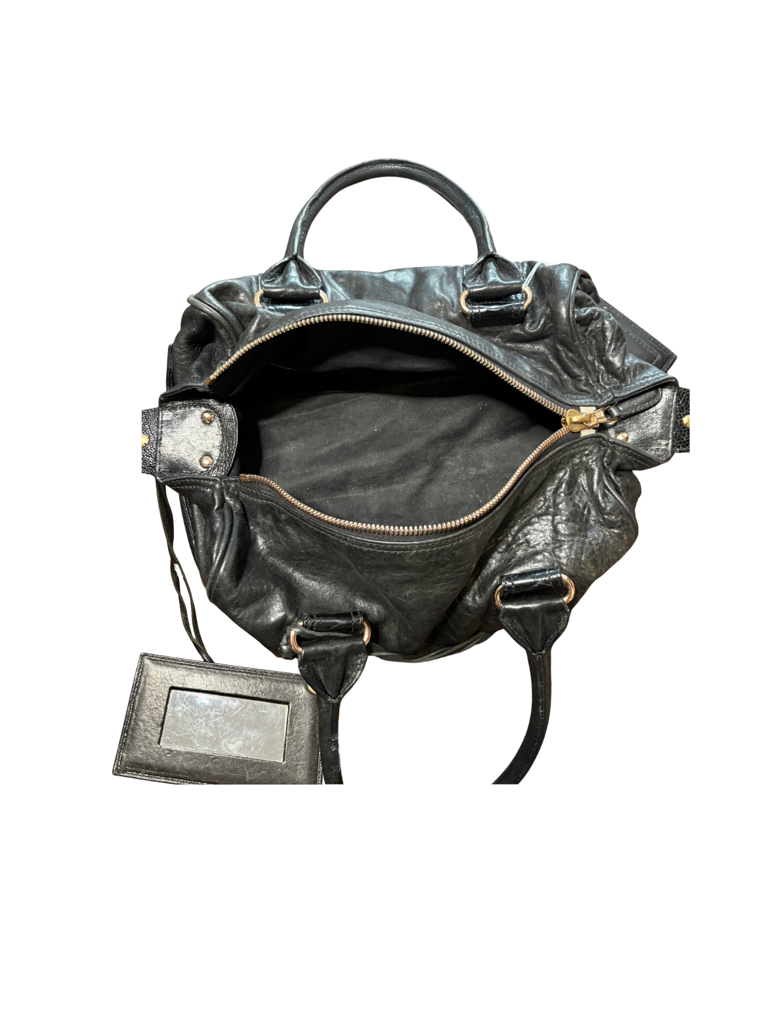 An iconic Balenciaga Paris leather bag crafted in soft, supple black leather with a perfectly slouchy silhouette. Designed with rolled top handles, signature stud detailing, and gold-tone hardware, it features a roomy interior with zip closure and an attached mirror for that classic Balenciaga touch. Effortlessly cool and endlessly wearable, this piece embodies early 2000s luxury with a lived-in feel that only gets better over time.