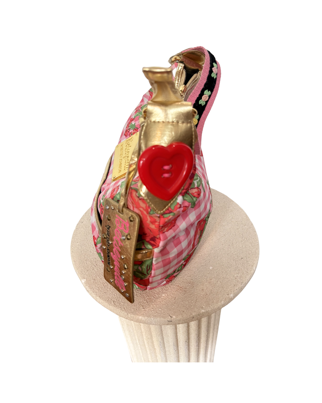 Betseyville by Betsey Johnson shoulder bag featuring a pink gingham base with bold rose floral print throughout. Designed with gold-tone trim, a curved top zip closure, and signature logo plaque at front. Includes a detachable Betseyville tag charm and playful red heart accents at the sides. Soft, slouchy silhouette with a floral embroidered strap.