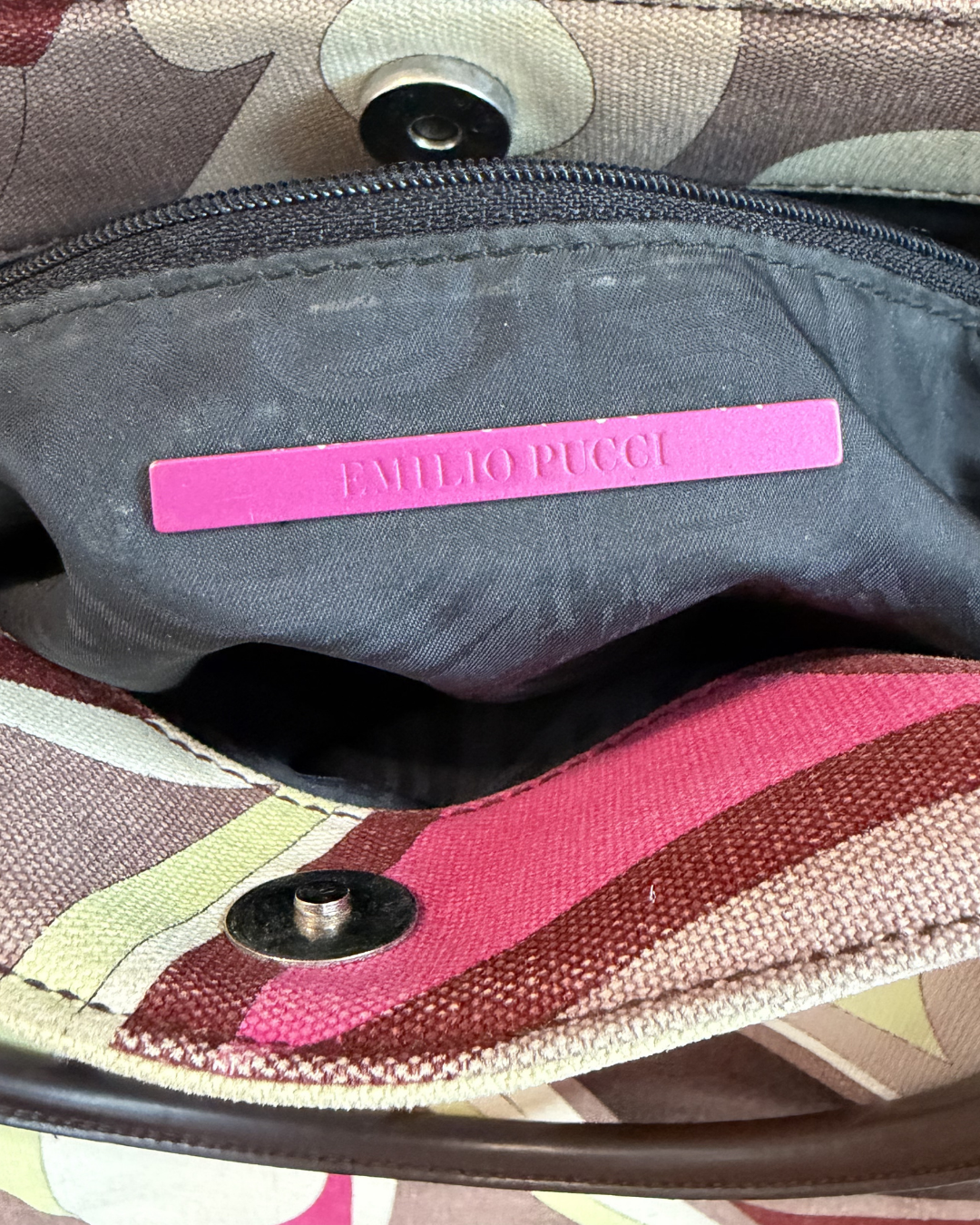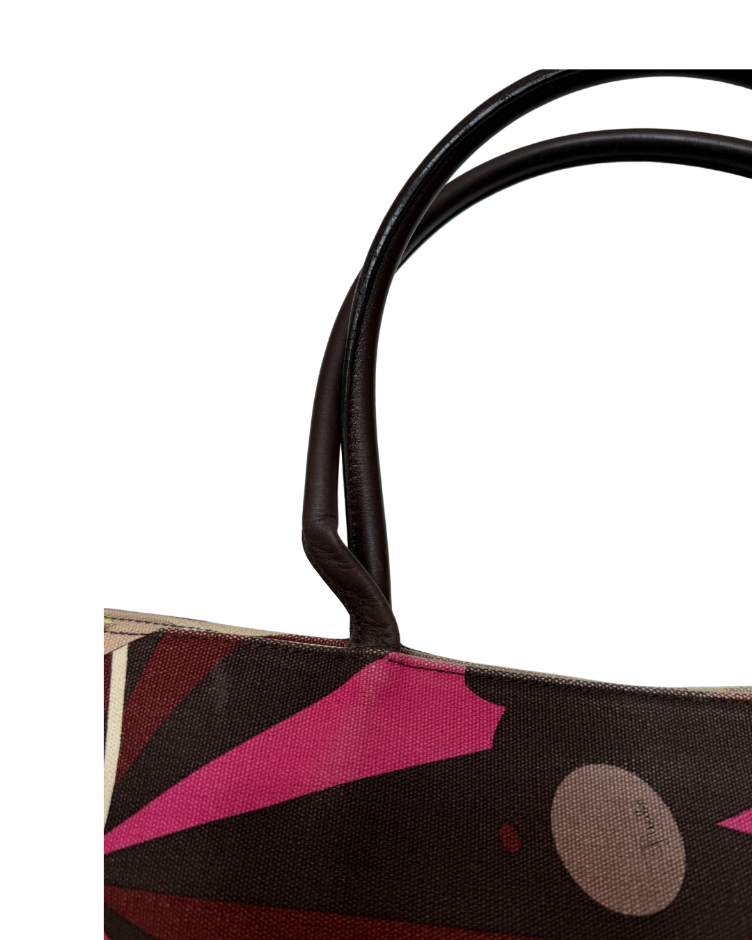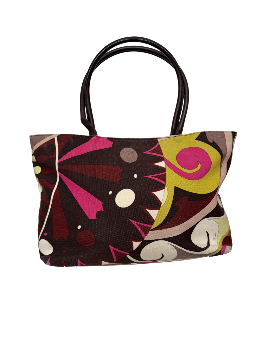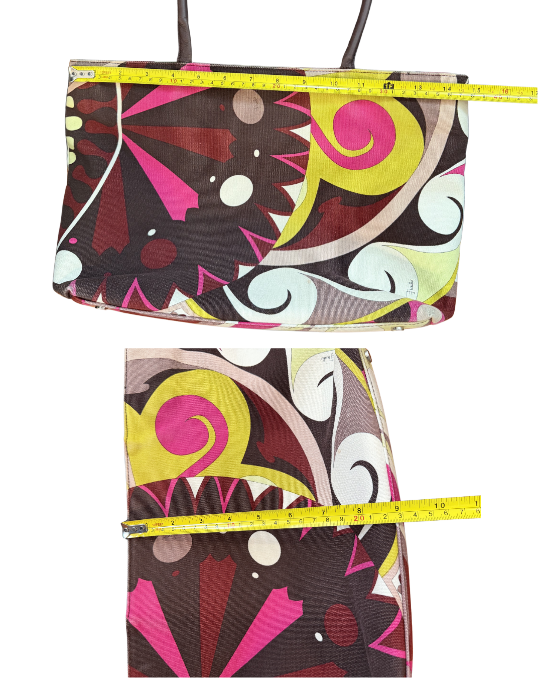 A statement piece straight out of Pucci’s iconic print legacy. This vintage Emilio Pucci tote features the brand’s signature psychedelic swirl pattern in rich earthy browns, soft creams, lime, and pops of hot pink. Crafted in structured canvas with sleek dark leather handles, it balances bold design with everyday wearability. Spacious enough for daily essentials, this bag is the perfect mix of art and function! *A few small marks over the bag and damage to one of the straps as shown in photos*